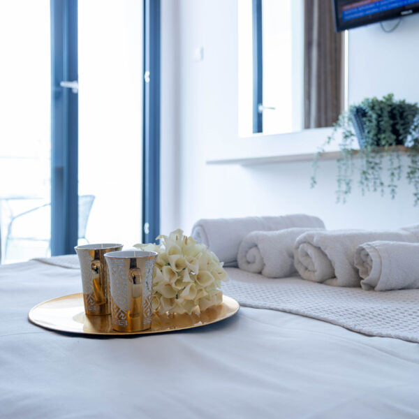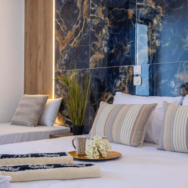 Το τρίκλινο δωμάτιο συνδυάζει κομψότητα και άνεση, προσφέροντας υπέροχη θέα στη θάλασσα από το μπαλκόνι και κρεβάτια που εξασφαλίζουν βαθύ και αναζωογονητικό ύπνο.